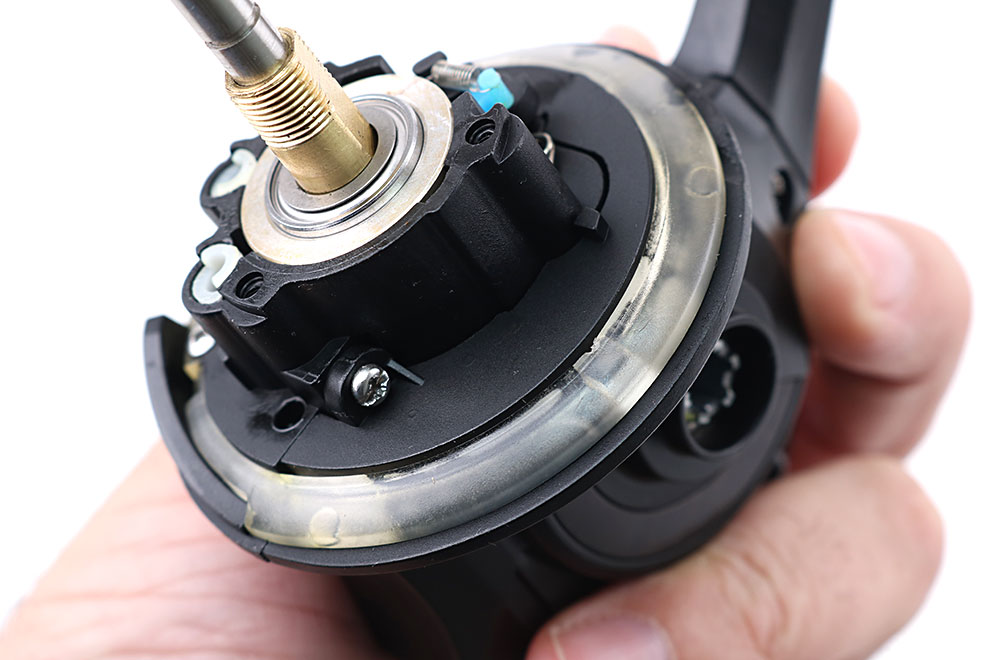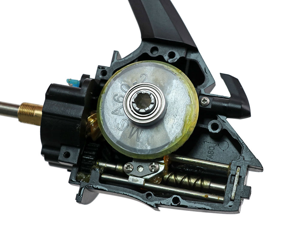 Ceo mehanizam ove mašinice je odlično uležišten, osovine počivaju na kugličnim ležajevima velikog prečnika i sve deluje jako i robusno. Pogonski mehanizam Escola se vrti verovali ili ne na čak 11 kugličnih ležajeva uz dodatak jednosmernog (super-stopera) koji momentalno zaustavlja rotor. Neću nabrajati gde su sve ležajevi jer kad ih ima ovoliko - oni su bukvalno svuda gde se nešto vrti i to najčešće po dva komada u paru (dva su čak i u rukohvatu ručice), što se itekako oseti na lepom, laganom i mekanom radu ove mašinice.