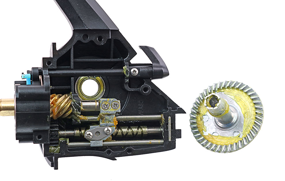 U unutrašnjosti Escola krije veliki i masivan pogonski zupčanik izrađen od legure cinka te gonjeni rezan od mesinga. Klasično, provereno i ekonomično rešenje jer ne podiže previše cenu mašinici a obavlja dobro posao.