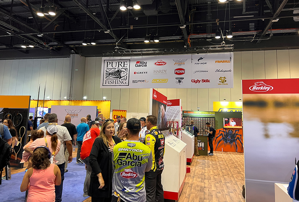 Centralni deo Pure Fishing štanda sa puno profesionalnih ribolovaca koji su bili na usluzi posetiocima