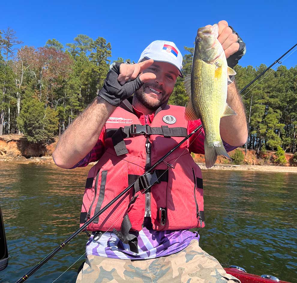 Pecamo kao nategnute strune na violini, koncentracija na maksimumu. Čamac nam je na dubini od nekih 8-10 metara i na 30-tak metara od obale i bacamo drop shot sisteme u samu obalu pa polako svačimo prema dubini. U obali je stenoviti plićak sa razbacanim palim drvima, deblima i panjevima u plićaku svuda okolo, a na nekih 4-5 metara od obale zatim ide odsek i naglo povećanje dubine i bassovi su izgleda bili „naslagani“ tu. Teren kao izmišljen za krupne ribe. Posle nekih 15-tak minuta pecanja osetim blagi čvrk dole, ništa nije slutilo kolika je riba u pitanju, kratka kontra iz zgloba šake i kreće rodeo! Ogroman bass mi je uzeo varalicu i krenuo je prema dubini kao ekspres voz! Nabija na dole, Daiwa Luvias štap od 2.10m i 5-28g savijen potpuno u kiflu, fluorokarbonski Daiwa predvez 10 lbs na ivici pucanja… Srećom pa sam prethodni dan fino podesio kočnicu na mašinici (inače je na našim krševitim terenima držim jako zategnutu i ne dam ribi da previše driluje) pa je Daiwa 18 Exist 3000D-C savršeno drilovala i popuštala strunu baš kad zatreba, a lagana Daiwa 3/0 SaqSas worm udica je takođe sve izdržala. Riba je probala i da se uplete oko motora i elise, a kada joj to nije uspelo – zaletela se gore u želji da iskoči napolje… No sreća je tog dana bila izgleda na mojoj strani, uspeo sam sve to da sprečim i Jodža je lepotana pokupio meredovom (iz drugog pokušaja)! Sve je to snimio telefonom naš vozač i drug Majkl. Auuu, da ste tu radost i naše krike čuli… i Majkl se radovao jednako glasno sa nama! Stavili smo bassa na vagu – 7.2 lbs (3.26 kg)! Ogromna riba kakvih nema kod nas kući! Spakovali smo ga pažljivo u tank sa vodom na kraju čamca (jedva je stao unutra) i nastavili pecanje.