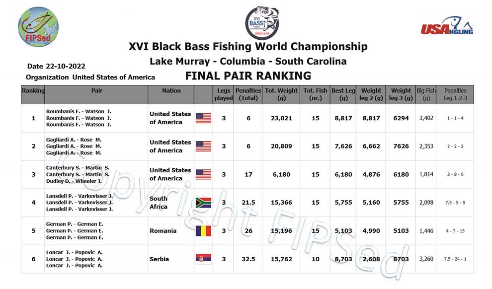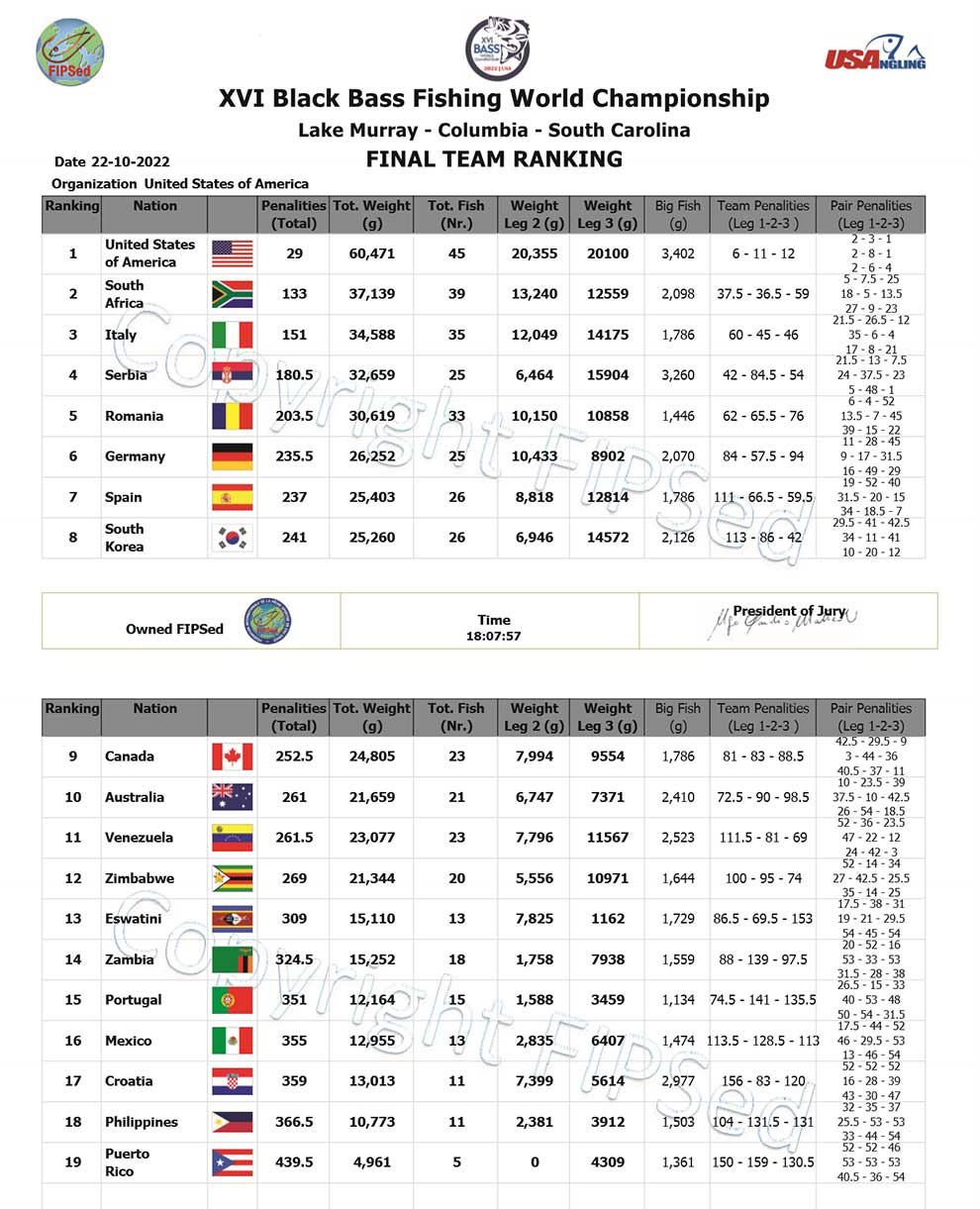 Ekipa Bojanić-Sirar je takođe fantastično otpecala i u 5 bassova imali su 13.6 lbs (6.2 kg) i bili su tog dana peti u generalnom plasmanu. Nažalost, saznajemo u samom finišu ceremonije da je loš ulov treće ekipe (samo jedan bass od 992 g odnosno 52. mesto) uticao na to da nam Italija pobegne opet za nekih 20-tak poena i gubimo za dlaku bronzanu medalju koja nam je eto bila sve vreme nadomak ruku. Potišteni smo zbog toga i trebalo je malo vremena da dođemo sebi i da shvatimo da je i 4. mesto ekipno za Srbiju u konačnom plasmanu odnosno 6. mesto na svetu u parovima za mene i Jodžu svejedno ogroman uspeh za malu zemlju poput naše, zemlju koja je ovde tek po drugi put učestvovala na svetskom prvenstvu, zemlju koja bassa ima tek u tragovima i gde takmičari pecaju iz malih drvenih i još manjih gumenih čamaca, pogonjenih slabašnim elektromotorićima… i gde se upravljači vodama trude da nam čak i te motoriće zabrane. Strašno.