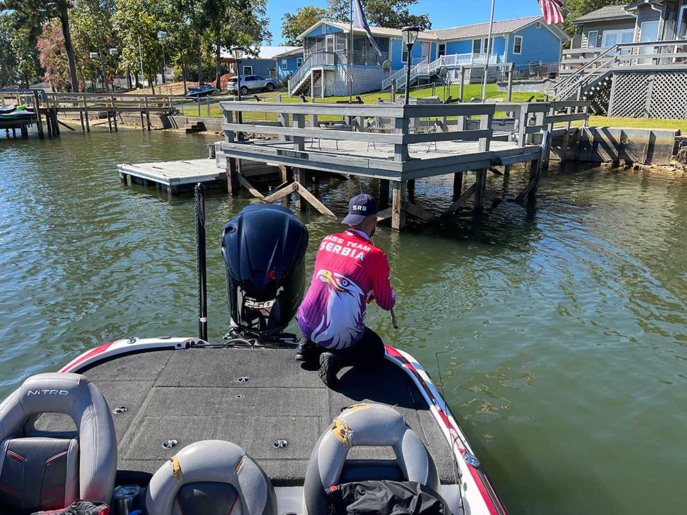 Sa trećom ribom od 2.9 lbs (1.3 kg) koju sam ulovio smo imali i malu dramu, po vađenju u čamac počela je obilno da krvari (nezgodno se ubola), nismo joj mogli ni izvaditi varalicu iz ždrela (duboko je progutala) bojeći se da je ne povredimo još više pa je vozač i sudija Majkl predložio da je idemo odmah izmeriti. Tako smo i uradili, prekinuli smo pecanje i otišli do start pozicije na ostrvu Dreher, tamo smo prijavili da riba ima i varalicu u sebi – rekli su nam da je to o.k, vi ste uradili sve što je do vas, izmerili su ribu, izvadili joj udicu i nastavili smo zatim pecanje. Izgubili smo tu dosta vremena ali šta da se radi, svaka riba je bila strašno dragocena. Zatim smo lovili dalje i imali više primeraka ispod mere a onda riba negde oko 14.00h skoro potpuno staje, ne javljaju se više ni ti primerci ispod mere. Vreme prolazi i razmišljam „100 na sat“ šta da radimo, imamo lep ulov ali ipak nisam zadovoljan, svetsko je prvenstvo i moramo dati i preko svog maksimuma… Gledam na telefonu i sonarima mape jezera i kažem našem vozaču Majklu da nas vozi u malu marinu pored mosta u „Hollow Creek“ rukavcu jezera. Milion puta sam gledao na TV-u „Major League“ i druga američka bass takmičenja i mnogo se lovi na takvim mestima (pogotovo kada se nema bolja ideja), pa zašto da ne pokušamo? Čuli smo se u međuvremenu telefonom i porukama više puta i sa ostalim ekipama, razmenili informacije i kako smo čuli i oni imaju po jednu do dve ribe ali ništa preterano krupno, trude se svi da ulove još koju ribu ali je baš, baš teško. Stižemo u malu marinu i krećemo da zabacujujemo i skipujemo oko parkiranih brodova i čamaca odnosno pontonskih molova. Posle jedno 15-tak minuta pecanja pored jednog praznog mola iz kojeg je pre toga verovatno isplovio neki brodić, na „wacky“ tehniku i neotežanog Senka od 5 inča u propadanju na finoj dubini dobijam jedva osetan udarac, kontriram i odmah kreće da driluje krupna riba! Kako adrenalin u tim trenucima radi, ne možete verovati! Četiri dana na tu moju inače omiljenu tehniku nisam imao nijedan napad a kamoli ribu i onda baš kad nam treba dobijem na to lepu ribu! Bass se baš borio, nabijao u dubinu i pokušavao i da se otkači i iskočio je u jednom trenutku ali mu to nije uspelo i uskoro smo u meredovu imali lepu ribu od jedno 1.6-1.7 kg! E da ste videli tu našu radost… To nam je bila četvrta riba i do kraja tog dana više nismo imali ništa ali sa te četiri ribe na merenju prvog dana završavamo tako što delimo 7. i 8. mesto (7.5 plasmanskih poena) na svetu sa jednim južnoafričkim parom koji je u gram imao istu težinu ulova ali i jednu ribu više od nas. Ostala dva tima do kraja takmičenja uspevaju takođe da ulove po još jednu ribu tako da obe ekipe imaju po 3 ribe, ekipa Stojaković-Todorović završava dan kao 13.-ta a Bojanić-Sirar deli 23. i 24. mesto sa jednim italijanskim parom (23.5 poena). Sa tih zbirno 42 plasmanska poena posle prvog dana takmičenja Srbija je treća iza domaćina USA i Južnoafrike Republike! Iza nas su taj dan Rumuni (još jedno veliko iznenađenje ovog prvenstva) zatim Italijani i tako dalje. Iznenađenje dana su i Hrvati odnosno činjenica da su sva tri njihova tima prvi dan došla sa nulom na merenje (čak 14 timova tog dana je ostalo potpuno bez ulova). Veliko oduševljenje nastupa u našem kompletnom timu ovakvim neočekivano dobrim rezultatom i to nam je dalo „krila“ da se baš „naoštrimo“ za sledeće dane.