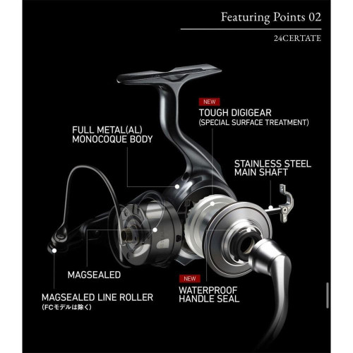 Daiwa 24 Certate LT 5000D je opremljena najnovijom tehnologijom kompanije Daiwa, uključujući revolucionarni Airdrive dizajn, koji pruža vrhunsku operativnost uz maksimalnu snagu i čvrstinu. Airdrive Design omogućava izuzetnu kontrolu, smanjenu težinu i pomeranje balansa unazad za bolju osetljivost i poboljšano zabacivanje. Monocoque aluminijumsko kućište i MagSealed sistem osiguravaju zaštitu od prodora vode i prljavštine, produžavajući vek trajanja mašinice. Mašinica poseduje 10 CRBB kugličnih ležajeva koji su otporni na koroziju i habanje + 1 valjkasti, I-Shape aluminijumsku dršku, ATD™ Type-L sistem kočenje koji osigurava glatko i progresivno oslobađanje strune.